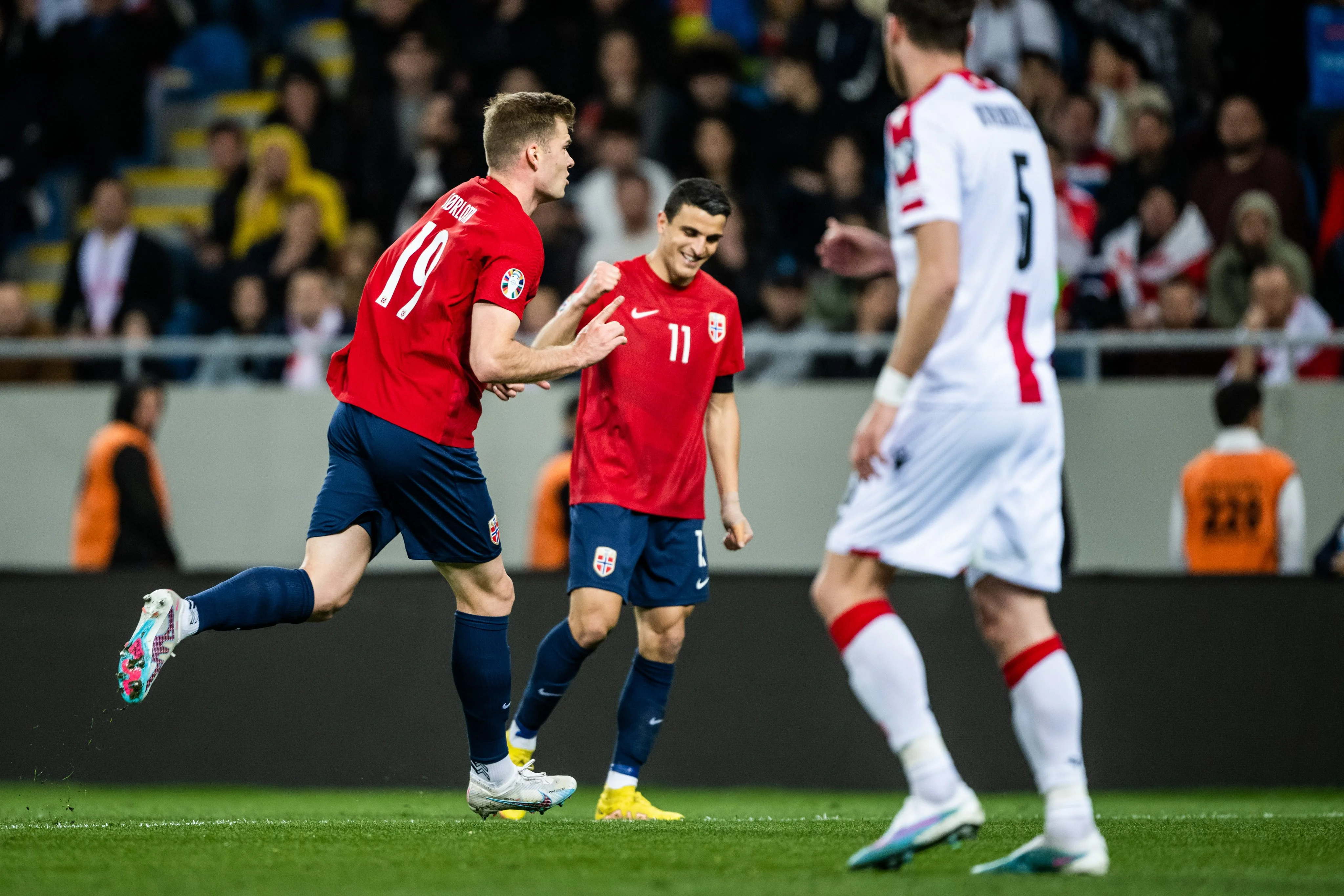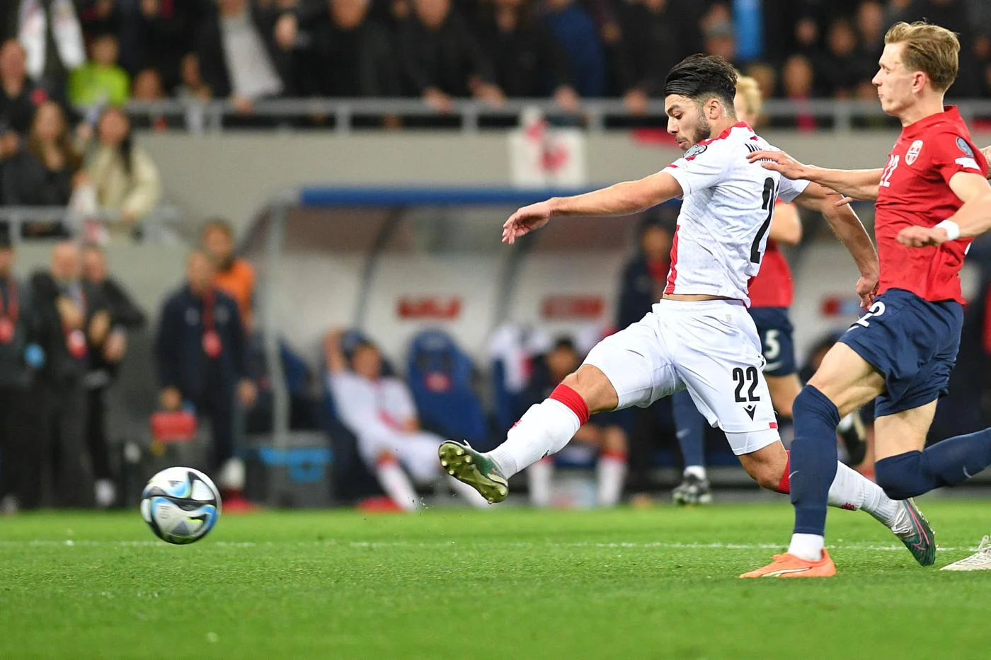 Грузини виставили бойовий склад включно з Кварацхелією. Норвежці ж приїхали без Холанда, однак і без нього команда шикарно провела першу годину зустрічі. Вже на 15-й хвилині вони відкрили рахунок завдяки потужному пострілу Сьорлота з-за меж штрафного – форвард Сосьєдада влучив точно у дальній кут. 0:1!