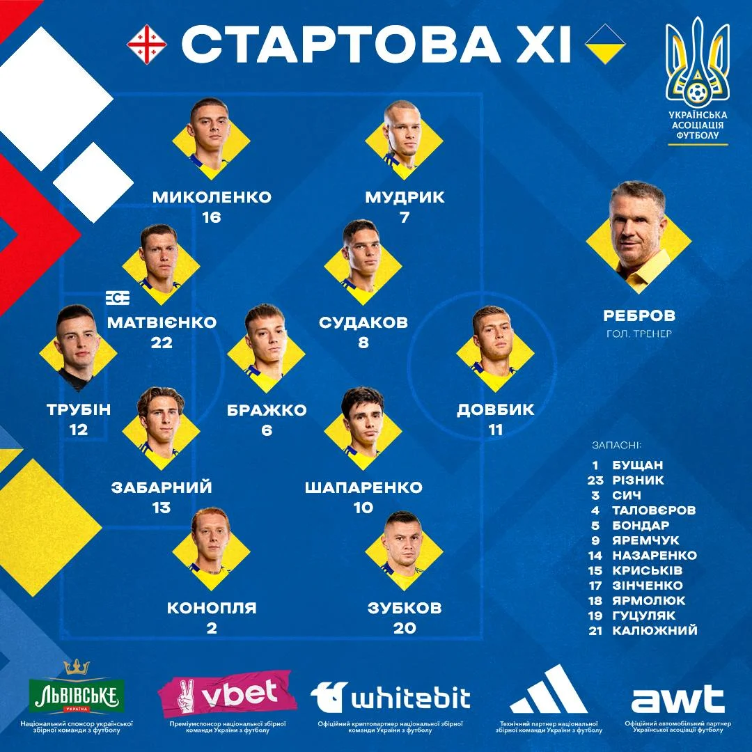 Довбик, попри невеличкі проблеми в підготовчому процесі, теж вийшов зі старту. А от у грузинів одна із зірок нападу залишилась в запасі – мова про Мікаутадзе, якого замінив Зівзіадзе. Позицію дискваліфікованого Двалі в центрі оборони закрив Лочошвілі, який у попередніх матчах діяв у ролі латераль. Вільну ділянку зайняв Шенгелія, а замість центрбека Гвелесіані вийшов Кверквелія.