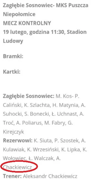 У спарингу Заглембє Сосновєц – Пуща (1:1) на поле вийшов 20-річний півзахисник Артем Хацкевич, який перебуває на перегляді. Цікаво, що Заглембє не вказав сина свого головного тренера, публікуючи склади команд. За нього це зробив суперник, після чого видалив склади. В їхній оновленій версії Артема Хацкевича вже не було, повідомляє Weszlo.