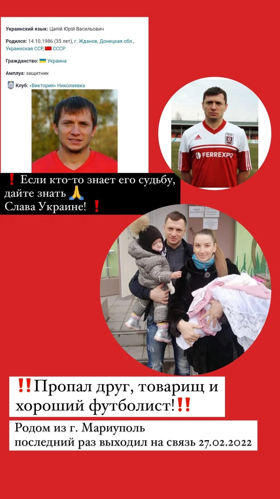 35-річний футболіст разом зі своєю сім'єю з 27 лютого не виходить на зв'язок, його місце перебування невідоме. Про це повідомляє Владислав Налигач у Facebook.