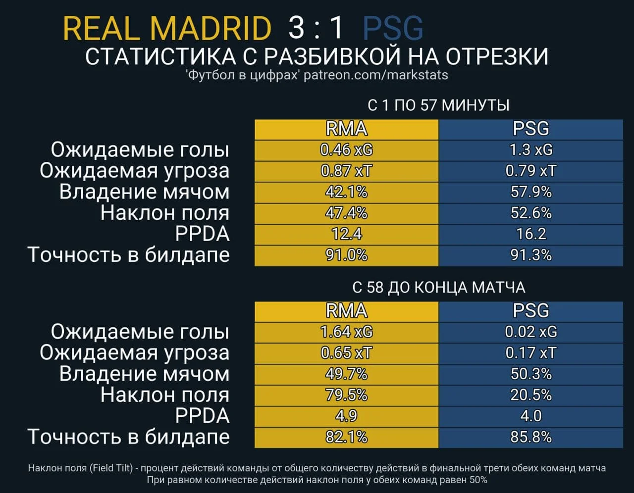 По-перше, Карло Анчелотті освіжив позиції Крооса та Асенсіо, випустивши замість них Камавінгу та Родріго. Цей хід несподівано переломив сценарій зустрічі – Реал став повертати м'яч після кожної п'ятої передачі ПСЖ на його ж третині поля, провів 11 ударів проти одного у гостей і награвши на 1,64 xG (по суті, на 2 голи). Але чи можна назвати це головною причиною подальшого провалу французів?