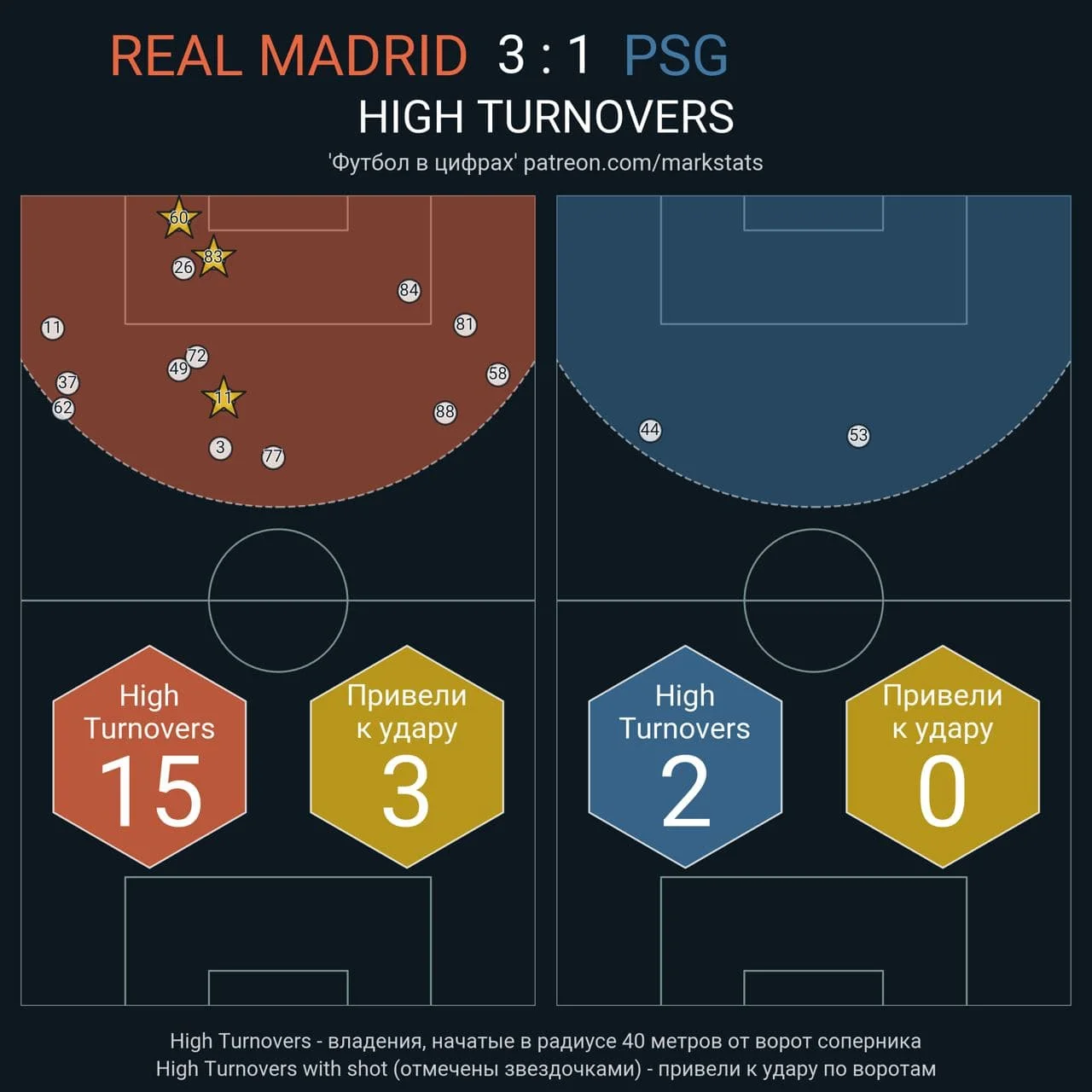 Ключовим елементом успіху Реала став високий пресинг. В перші 15 хвилин "вершкові" позначили бажання відбирати м'яч далеко на чужій третині поля – мадридці видали значно вищу інтенсивність пресингу, провели 3 удари (1 в площину), тримали володіння на рівні 51,4% й сміливо йшли у дриблінг з хорошим результатом (6 спроб, 5 успішних). Щоправда, потім ПСЖ адаптувався завдяки відходу Верратті назад та опусканню Мессі й Неймара до групи півзахисників.