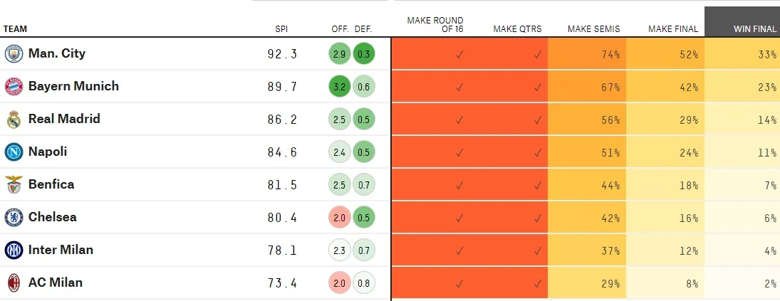 Суперкомп'ютер Five Thirty Eight оприлюднив оновлений прогноз на вирішальну стадію Ліги чемпіонів. Оцінки традиційно базуються на силі складів команд і їхніх останніх виступах.