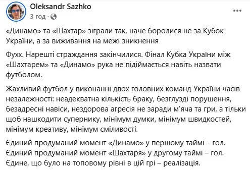 Шахтар уп'ятнадцяте здобув Кубок України і за кількістю виграних фіналів відірвався від столичного клубу (у Динамо їх 13). Сам матч кардинально відрізнявся від квітневого Класичного у чемпіонаті, де команди грали, не озираючись на тили, і закінчили видовищними 2:2. Нерви та жорсткі зіткнення – ось тренд поєдинку у Житомирі. Далеко не всім це сподобалося.