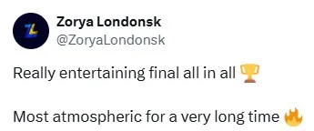 Ендрю Тодосу (Zorya Londonsk) сподобалося. "Справді цікавий фінал загалом. Найбільш атмосферний за багато часу", – пише він.