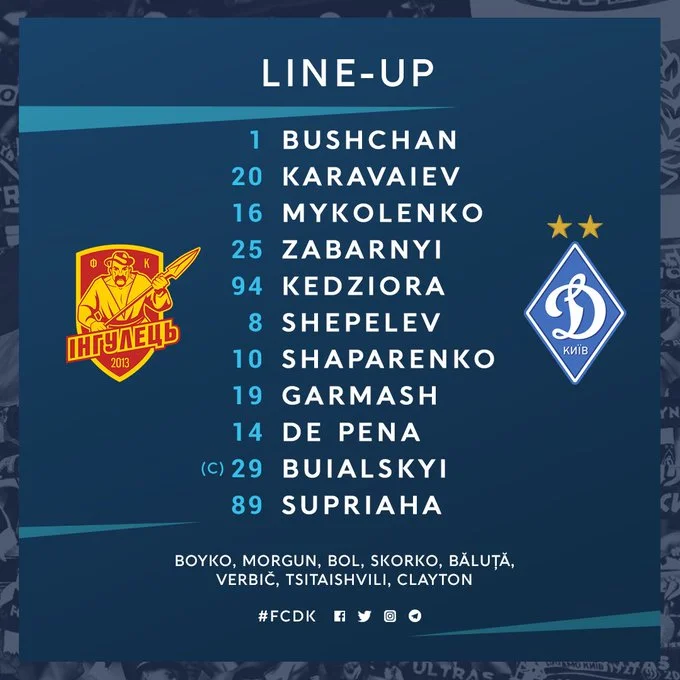 Динамо: Бущан – Кендзьора, Забарний, Миколенко, Караваєв – Шапаренко, Шепелєв – Гармаш, Буяльський, Де Пена – Супряга