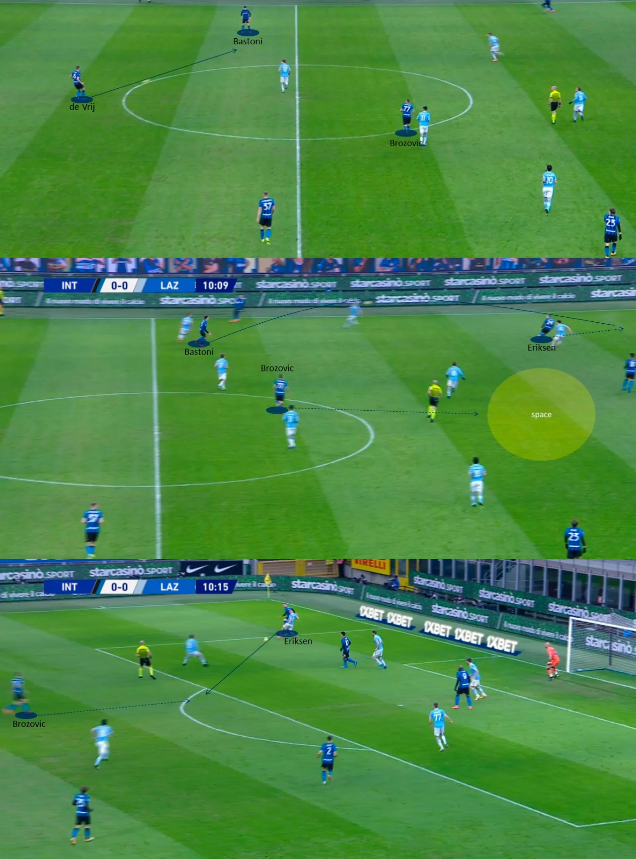 В позиційному ж наступі все зводилось до здатності Еріксена, Лаутаро та Лукаку працювати між лініями. Ось як вони спрацювали перед першим голом: Крістіан під тиском трьох виконавців вирізав передачу на Ромелу, а Лаутаро відкрився за спину Худту – всі розташувалися ідеально для виконання стіночки з передачею на хід.