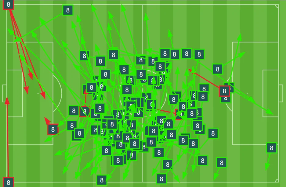 Тоні Кроос завжди виділяється шаленим обсягом роботи в підігруванні партнерам, але у поєдинку з Інтером він перевершив сам себе – німець віддав 124 передачі, побивши рекорд Ліги чемпіонів. Тринадцять пасів виявились проникними, п'ять призвели до небезпечних моментів, а ще два пройшли під удар. 12 з 13 довгих передач Крооса знайшли адресата, а загальна точність дистрибуції сягнула 98%. На карті це виглядає ось так:
