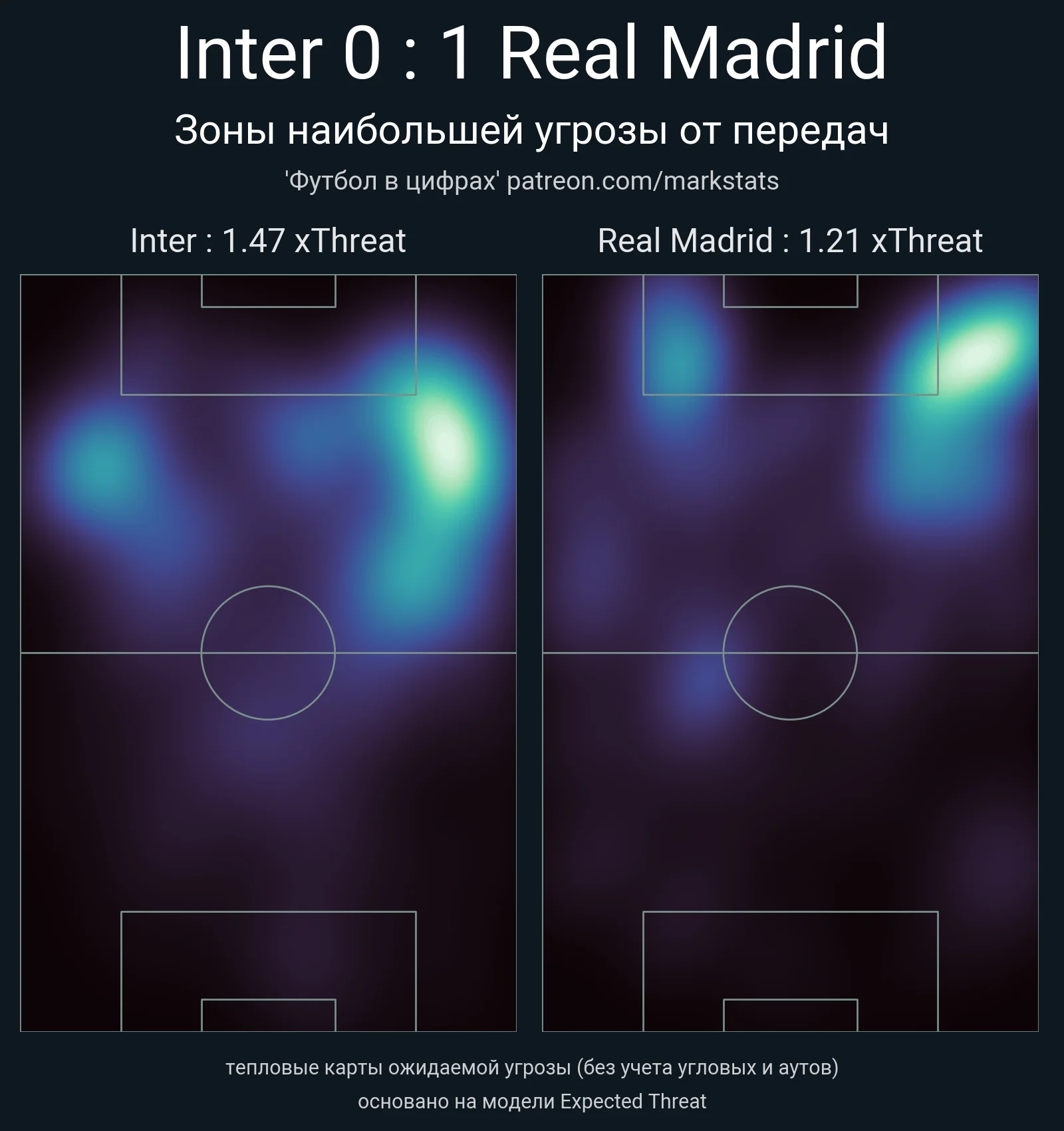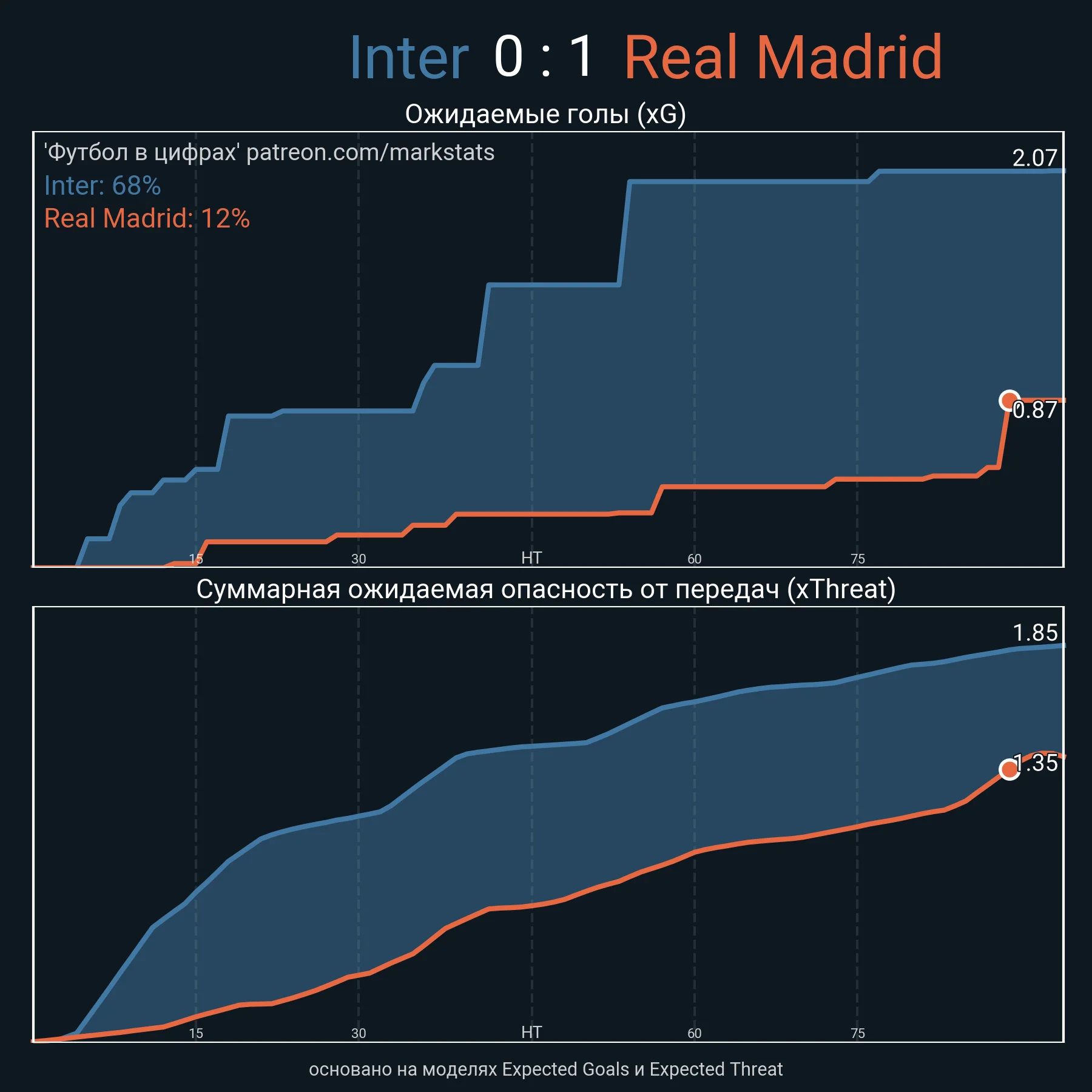 Розпочавши жахливо, Реал перевершив Інтер і за володінням (57%),і за діями на чужій третині (30% дотиків на ній проти 24% у міланців), і майже дотягнувся до показника гостроти передач "нерадзуррі" (1,47 vs 1,21). Не вистачало лишень достатньої кількості моментів, але підопічні Карло Анчелотті показали клас – їм достатньо і трьох гольових нагод за тайм, аби забити переможний м'яч. Інтер же не забив жодного при 18 ударах та 2,02 xG. В цьому і полягає різниця.
