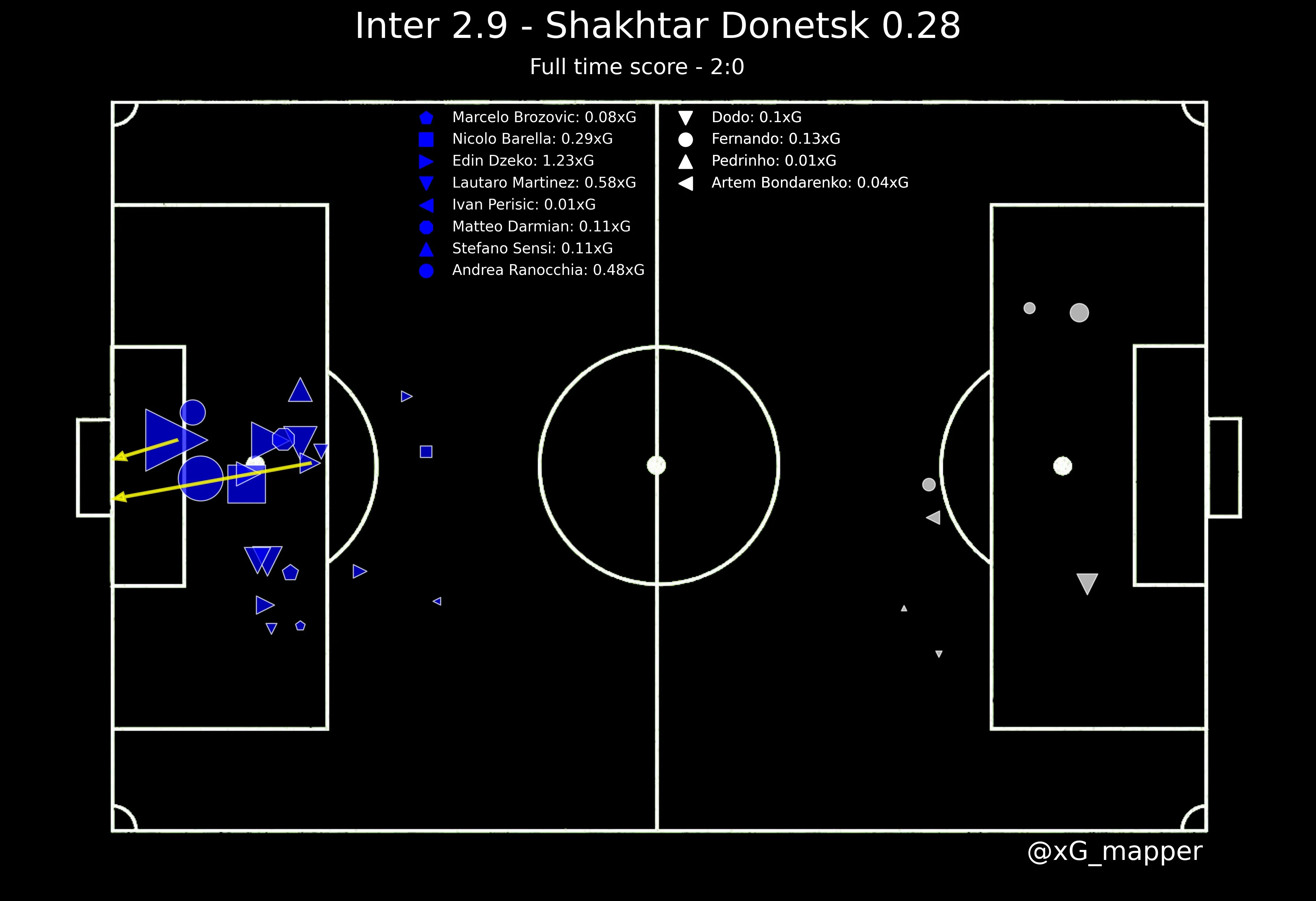 Саме Михайло класно розігнав контру, далі Соломон переправив у центр, Марлос викотив на ще кращу позицію – Додо розстрілював Хандановіча з меж воротарського. Стійка, а далі м'яч котиться по лінії воріт без шансів на добивання Мудрика. За ударами 21:7, повний розстріл Трубіна з меж штрафного (17:3). Очікувані голи відображають хід і результат сьогоднішнього жахіття (2,9:0,28 за xG). Інтер очолив таблицю, випереджаючи Реал на 1 пункт до матчу мадридців у Молдові. Шахтар, як і Динамо, фінішує на останньому місці за тур до кінця групового етапу Ліги чемпіонів, набравли ше 1 бал. Знайти виправдання команді Де Дзербі важко. Шериф, за всієї поваги до Вернидуба, це навіть далеко не Бенфіка.