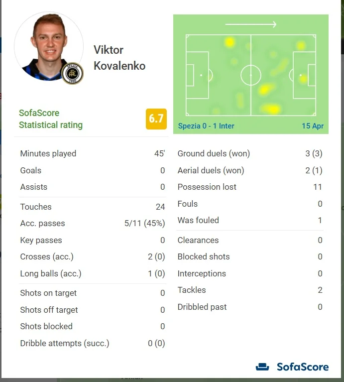 Розплата за таке марнотратство виявилася блискавичною. Д'Амброзіо виграв верхову боротьбу і скинув під удар Брозовічу. Хорват з лінії штрафного потужним пострілом зняв павутину з дев'ятки воріт Проведеля. Голкіпер не мав шансів зреагувати. Ось так Інтер з доволі неочевидного моменту забив і пішов на перерву лідером. Коваленку залишається лише картати себе за втрачений шанс, адже на другий тайм Віктор уже не вийшов. Його замінив Агудело, який відразу ж міг зрівнювати. Знову Хандановіч врятував.