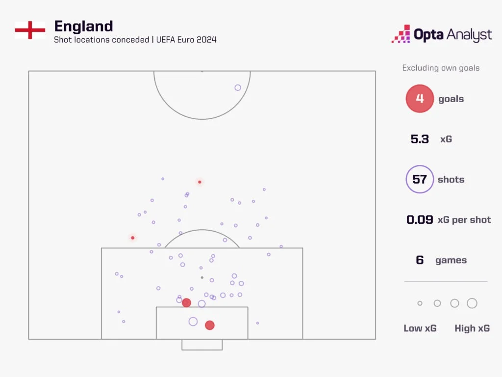 З іншого боку, суперники теж створили обмаль. Британцям постійно вдається затягувати гру в нудне "болото" – на Євро-2024 вони мають найнижчу середню гостроту допущених моментів (0,09 xG, 57 ударів), але й самі генерують мізерні 0,88 xG за гру.
