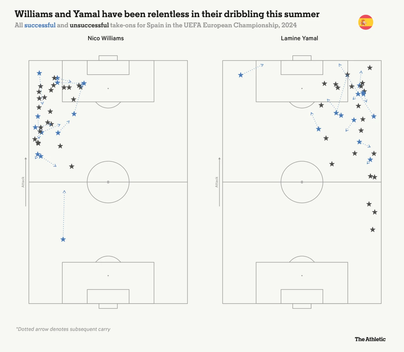 Іспанія на Євро-2024 лідирує за очікуваними голами (10,9 xG), просуваннями на дриблінгу та дотиками до м'яча на чужій третині, а за передачами в штрафний та за дотиками в ньому йде другою. За кількістю та успішністю спроб дриблінгу серед учасників плей-офф "Фурія" тримається в топ-3 турніру.