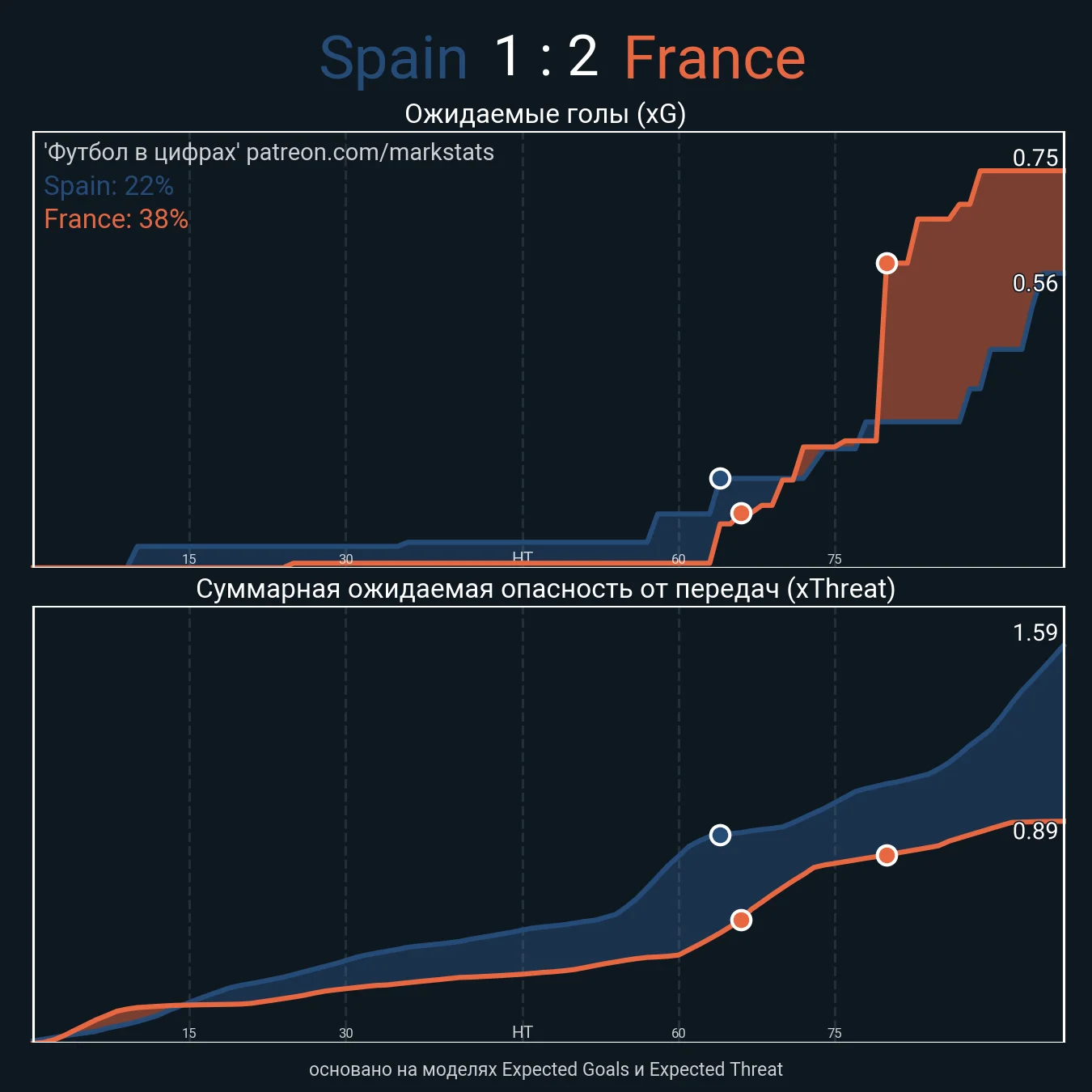 Окей, Франція створила не набагато більше, але наскільки ж гострішими були "Ле Бльо"! Перший удар стався на 63-й хвилині й одразу завершився влучанням у поперечку метрів з восьми. Гол Бензема – шедевр, але його провели з меж штрафного. Гол Мбаппе? Окей, нехай це буде офсайд, але це був вже не перший епізод, коли Кіліан отримав якісний пас за спини. При цьому французи свої моменти створювали з гри і навіть не з контратак.