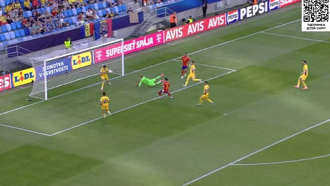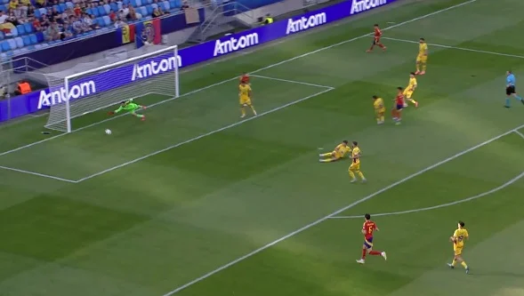 Далі – більше. На 18-й хвилині іспанці вчергове порвали лівий фланг оборони Румунії, завершивши атакою пасом на лінію воротарського. Голкіпер був практично відіграний, однак Дієго Лопес з шести метрів поцілив у Іліє на стрічці!