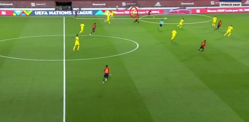 На цій схемі зображена структура білд-апу команди Андрія Шевченка. Сама структура чудова, тут питань немає, але складалося враження, що наша команда продовжувала грати зі Швейцарією. Протягом усього минулого матчу ми дивилися, як одна за одною, ще в зародку, захлиналися позиційні атаки збірної України. Пятов регулярно помилявся у передачах. Мало того, помилки Андрія системно призводили до небезпечних моментів поблизу його воріт. Я був майже впевнений, що тренерський штаб зробить висновки і на Іспанію вийде Лунін, чи команда змінить свій підхід до початку атак. Але, нічого не змінилося. Хіба Маліновський став діяти глибше, і на одного гравця у своїй третині поля стало більше.