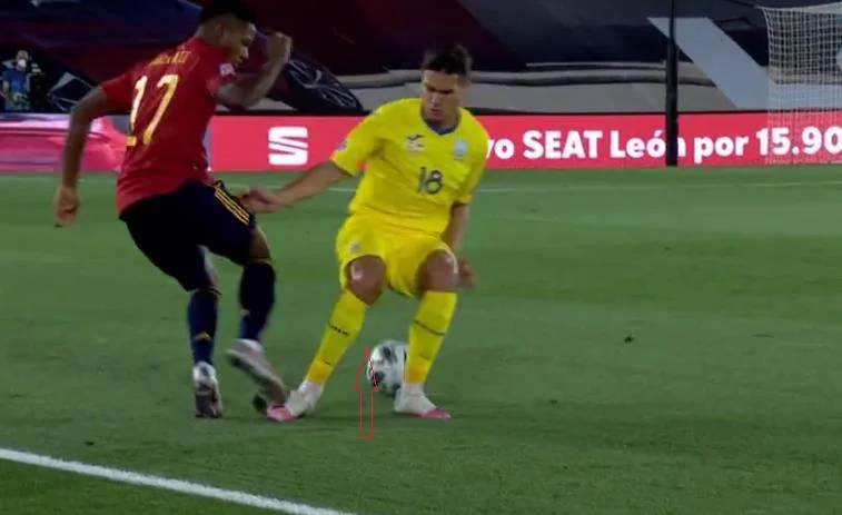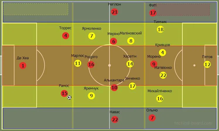 Мабуть, ще більш разюча різниця у активних діях центральних захисників. Рамос та Торрес грали високо і брали досить активну участь у переведенні м'яча з флангу на фланг. Не кажучи вже про внесок капітана збірної Іспанії у розіграшах стандартних положень. Він став автором дубля, реалізувавши пенальті, та перестрибнувши Кривцова після подачі з кутового. Обидва стандарти для Рамоса заробив Фаті. Звичайно, Серхіо штовхав Сергія, якби був VAR, то цей гол навряд чи б зарахували. Та, на це не потрібно скаржитись. У другому таймі нас врятував неоднозначний офсайд, та непризначений стовідсотковий пенальті.