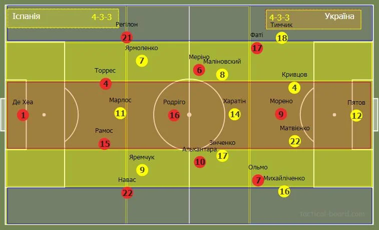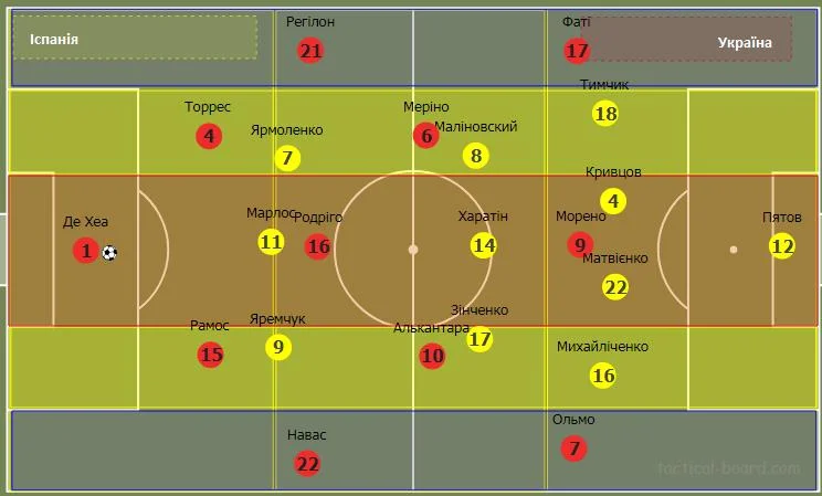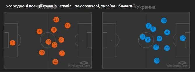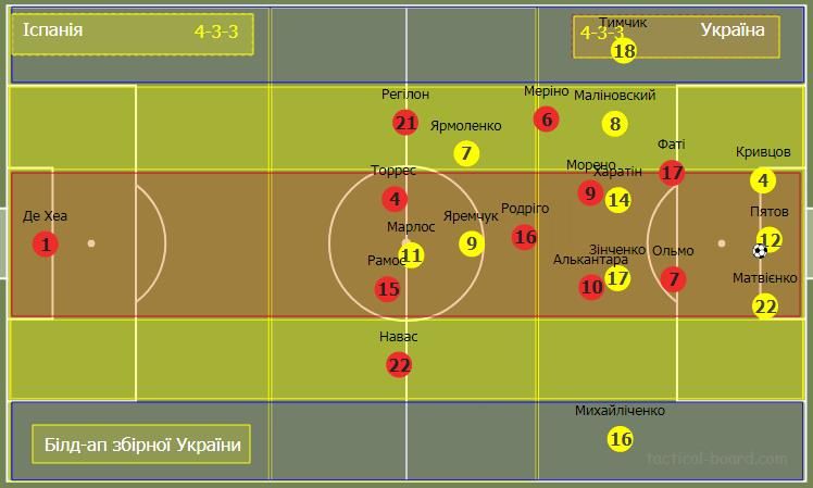 Перейшовши повним складом на половину поля суперника, футболісти збірної Іспанії формували кінцевий варіант своєї структури позиційної гри – 2-3-5. Вінгери зміщувалися у півфланги, а на краях у фінальній третині поля лінію оборони збірної України розтягували флангові захисники. Найбільша небезпека приходила з лівого флангу іспанців, де практично нестримним у першому таймі був Фаті. Ініціативи вінгера ефективно підтримував Регілон.