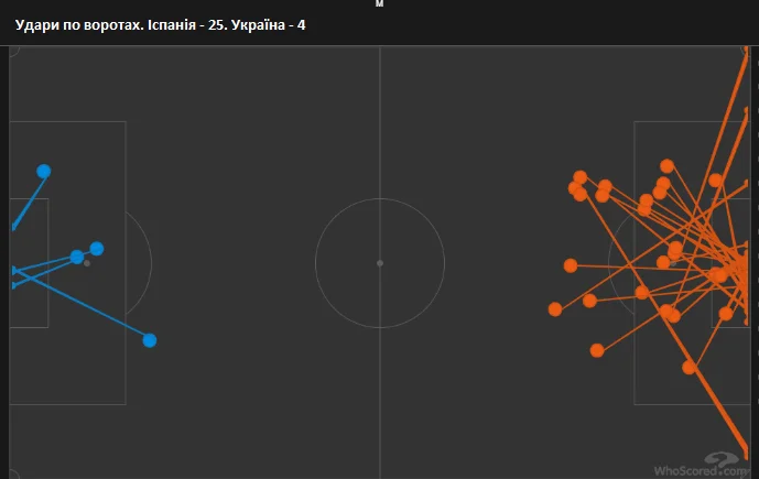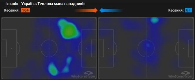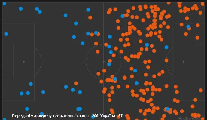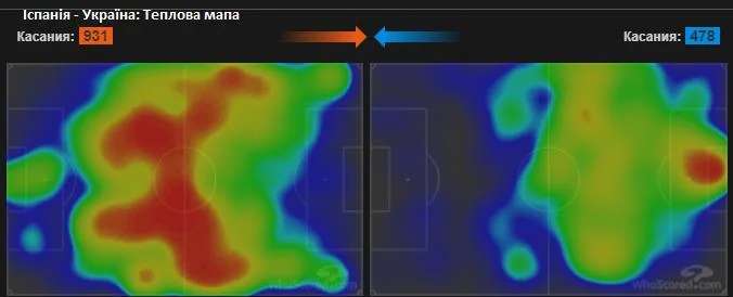 Гості бездарно виглядали у атакувальних діях. На своїй половині поля м'яч ще тримався. А от дійти до штрафного суперника дійти дуже складно. На третині поля Іспанії пройшло лише 12% загальних дій.