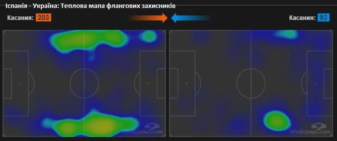 Можемо порівняти групи гравців обох команд по амплуа. Іспанські фулбеки більш ніж у два рази частіше контактували з м`ячем, не кажучи все про висоту дій.