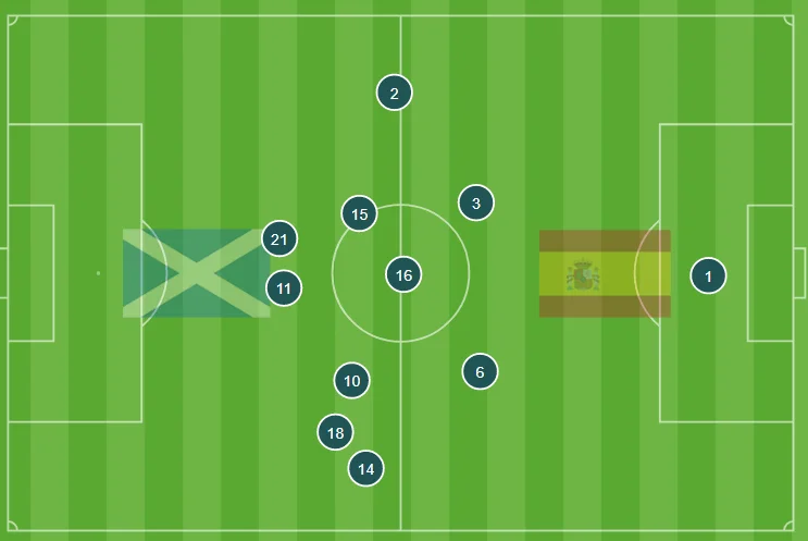 "Фурія Роха" залишається вірною схемі 4-3-3 з широкими позиціями фулбеків. Родрі (номер 16) все так же відіграє роль ключового моста між обороною та атакою, однак тепер працює в якості розігруючого опорника. Зберігається асиметрія флангів – як і за часів Луїсі Енріке, зліва більше обіграшів, а праворуч більше ізоляцій. Хоселу опускався до Піно й виконував функції фальш-дев'ятки, що типово для збірної Іспанії.
