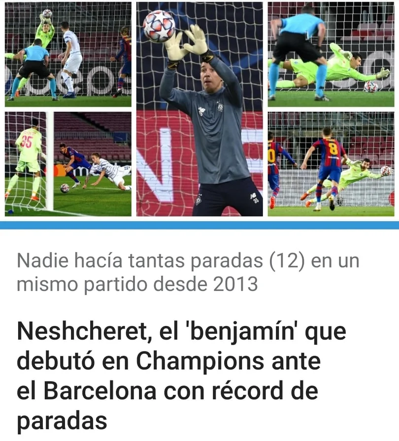 Три зірочки взяли тільки обидва голкіпери. Нещерет зібрав схвальні рецензії на всіх іспанських ресурсах як "найвидатніший гравець української команди". Вистачало і статей, присвячений суто особі Руслана. Уродженець Мукачева увійшов до історії під час свого дебюту в ЛЧ. Ніхто з 2013 року не робив у головному єврокубковому турнірі більше сейвів, ніж 18-річний український воротар (12). Другий наймолодший кіпер київського клубу за всю історію Ліги чемпіонів став головним героєм в Іспанії, затьмаривши навіть сейви Тер Штегена, гру Мессі з Фаті, класний гол захисника Піке, який продовжує мірятися результативністю з вічним антагоністом Рамосом.