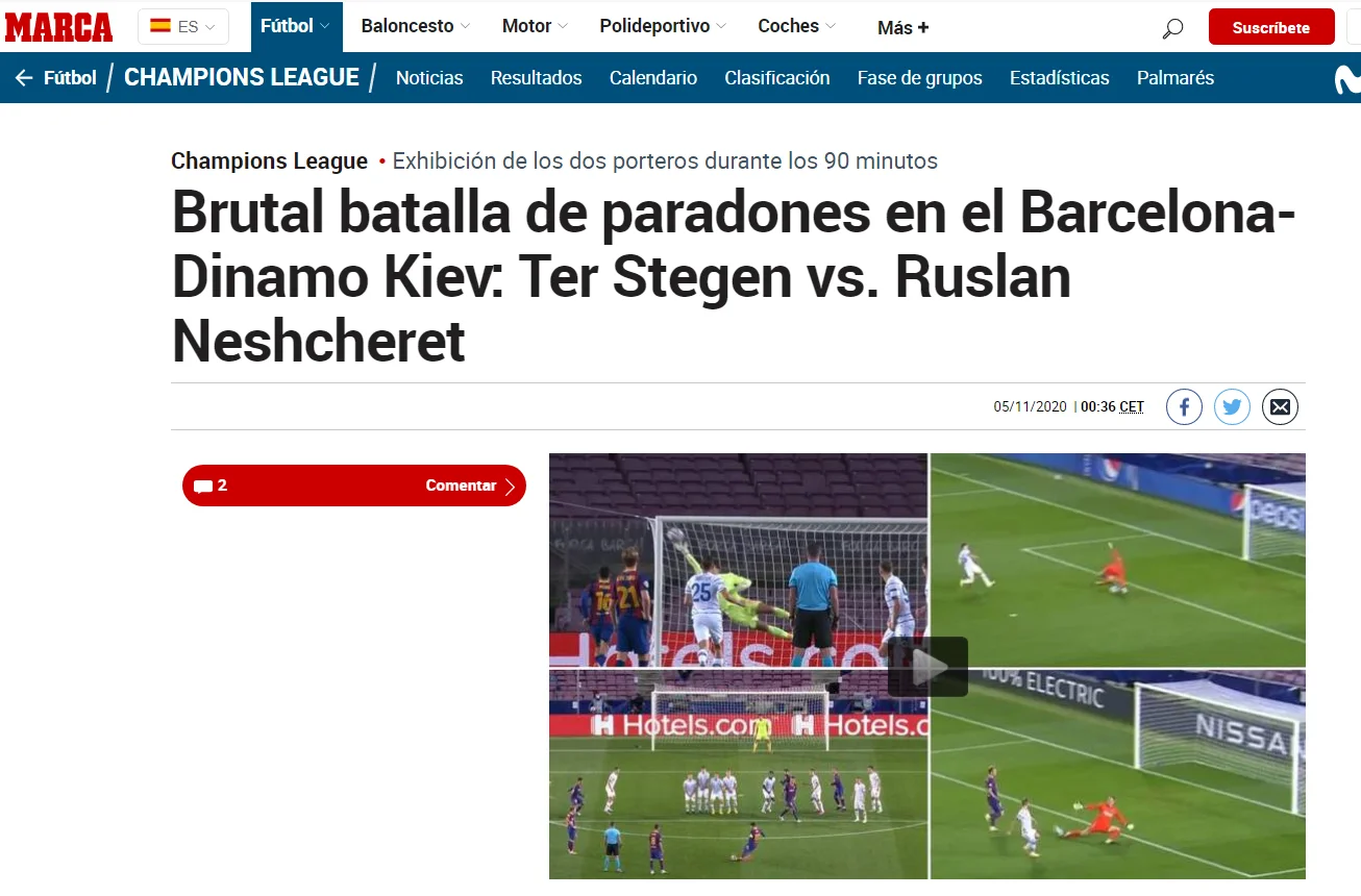 Барселона на своєму шляху пройшла дуже сміливе Динамо, впевнено проголошує мадридський AS. Тер Штеген завдяки 4 дивам став MVP матчу. Математично все казково, але гра була катастрофічною. Барса грала з вогнем. Газета порівнює ситуацію каталонців з параноїком, якого почали реально переслідувати. Сталося найгірше – команда Кумана, яка має відверті проблеми перед чужими воротами, вже на старті змарнували 3 супермоменти, аби добити хлопчика на ім'я Руслан Нещерет. Правило "анонімні діти проводять матч життя проти Барселони" спрацювало і цього разу, хоча старт гри створював враження, що ці 90 хвилин будуть катуванням для Динамо.