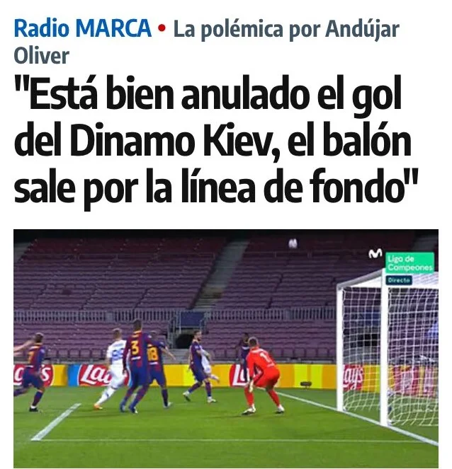 "Полеміка щодо скасованого гола. Жоден повтор так і не показав, за що в Динамо відібрали гол Кендзьори. На відео неможливо переконатися, що м'яч перетнув лінію поля у повітрі", –іспанська версія Goal.com вважає, що Майкл Олівер міг вплинути на результат матчу, адже захисник збірної Польщі зрівнював рахунок на 1:1, а після такого могло вже трапитися все що завгодно. А ось суддівський експерт Radio Marca Андухар Олівер, який раніше працював рефері на матчах першості Іспанії, переконаний – рішення бокового арбітра правильне. Мовляв, помічник головного судді має найкращий огляд, тому його підказка була коректною.