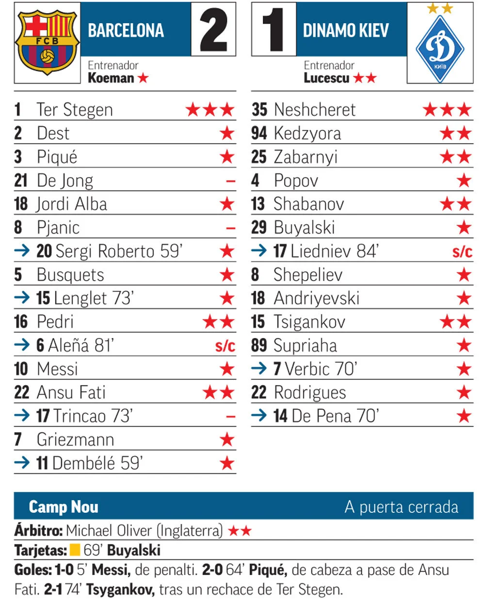 Куман був дуже близький, що дорого заплатити за свій експеримент з часів збірної Нідерландів, коли Де Йонг виходить у центрі захисту, але грає дуже високо і залишає безмежний простір на своїй половині. Marca навіть залишила Френкі без оцінки, як і П'яніча, який розчарував у центрі поля. Крім Тер Штегена, пристойний бал заслужили ще тільки молоді та старанні Педрі з Фаті. Видання з Мадрида оцінило Луческу на одну зірочку вище, ніж Кумана. Так само високо, як їхній тренер, стоять Кендзьора, Забарний, Шабанов і Циганков.