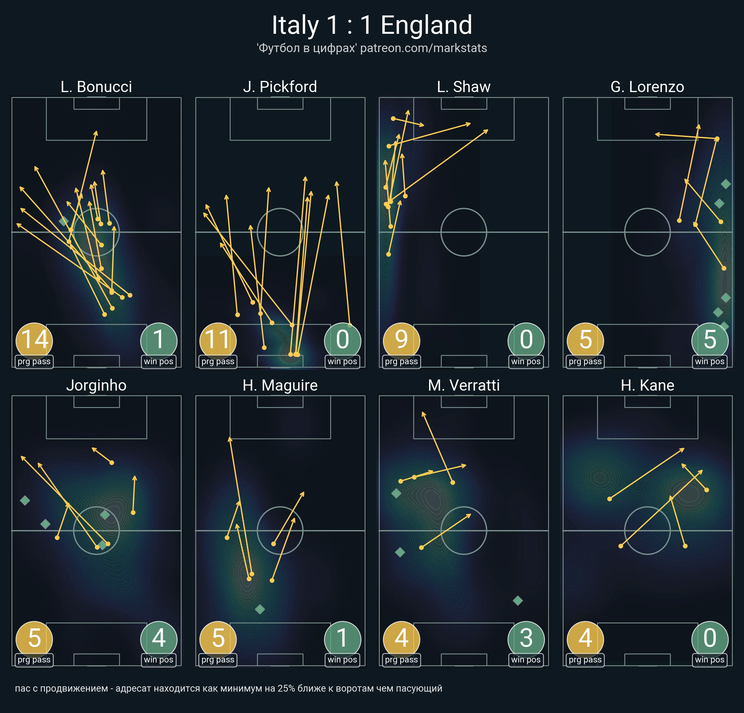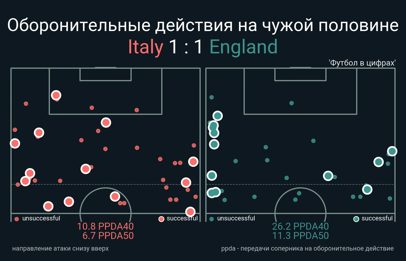 В принципі, перевага "Скуадри" в об'ємі атакувальної роботи очікувалась. Англія ж намагалася робити ставку на якість, перевершивши суперника за передачами в карний майданчик з гри, тримаючись на рівних за дотиками у ньому й не опускаючись нижче 0,11 xG за удар (середній показник острів'ян на Євро-2020).
