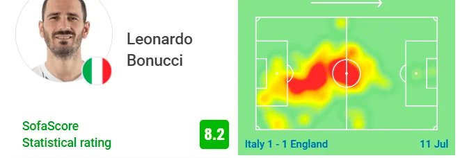 Теплова карта під Бонуччі просто палає, причому в центральному колі захисник "Скуадри" був не менш активним, ніж в задній лінії. Така висока мобільність Леонардо істотно допомогла гостям у встановленні контролю над зоною, яку раніше острів'яни нікому не віддавали – над середньою третиною (48% дій Італії у цій частині поля проти 40% у Англії). Зрештою, Бонуччі зрівняв рахунок, ставши найбільш віковим автором голу в фіналах Євро. Браво!