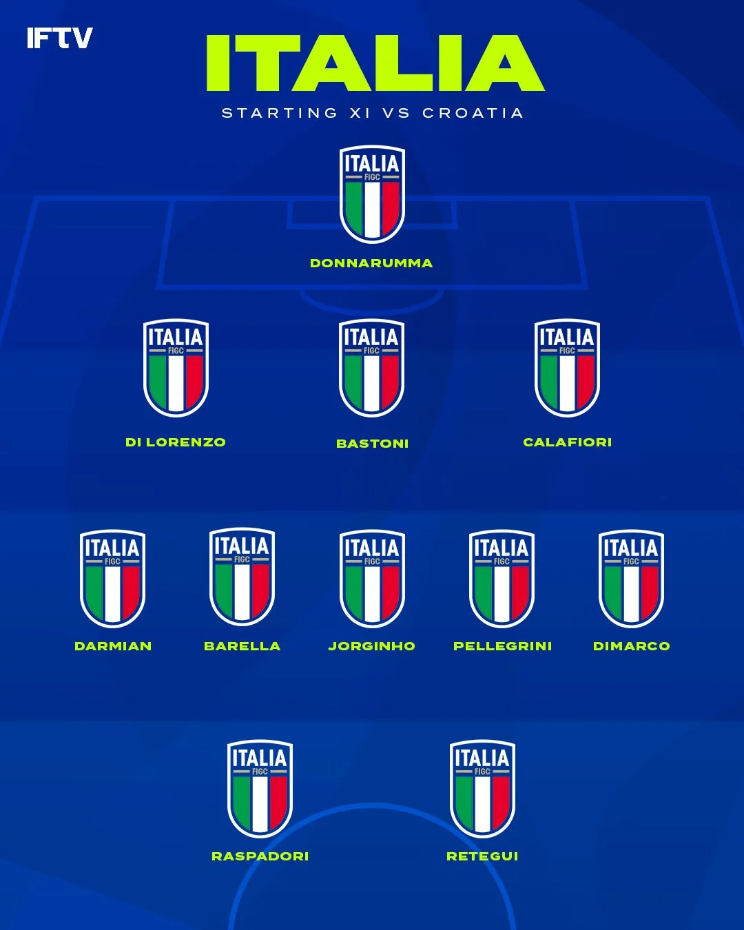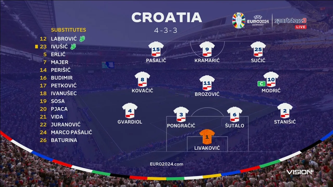 Златко Даліч вирішив у вирішальній битві проти Італії вирішив повернути Гвардіола на лівий фланг оборони. За мотивами матчу з албанцями було прийнято рішення щодо Пашаліча, Будіміра та Сучіча – вони вдало вийшли на заміну, тож проти "Скуадри" вийшли в основі. Станішіч знову зайняв позицію правого фулбека, а Понграчіч розташувався в центрі оборони (прямо як у грі з іспанцями).