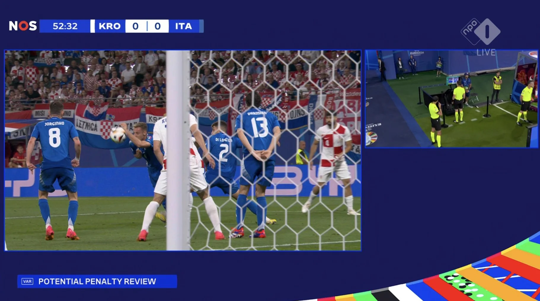 Чемпіони Європи впевнено стримували атаки хорватів. Распадорі зміщувався в опорну зону та тиснув на Брозовіча, Жоржінью допомагав підчищати за своїми вісімками. При цьому середній блок був дуже компактним, хоча довелося жертвувати свободою одного з балканських фулбеків. Як наслідок, у першому таймі Хорватія діяла повільно й завдала всього два удари по воротах.