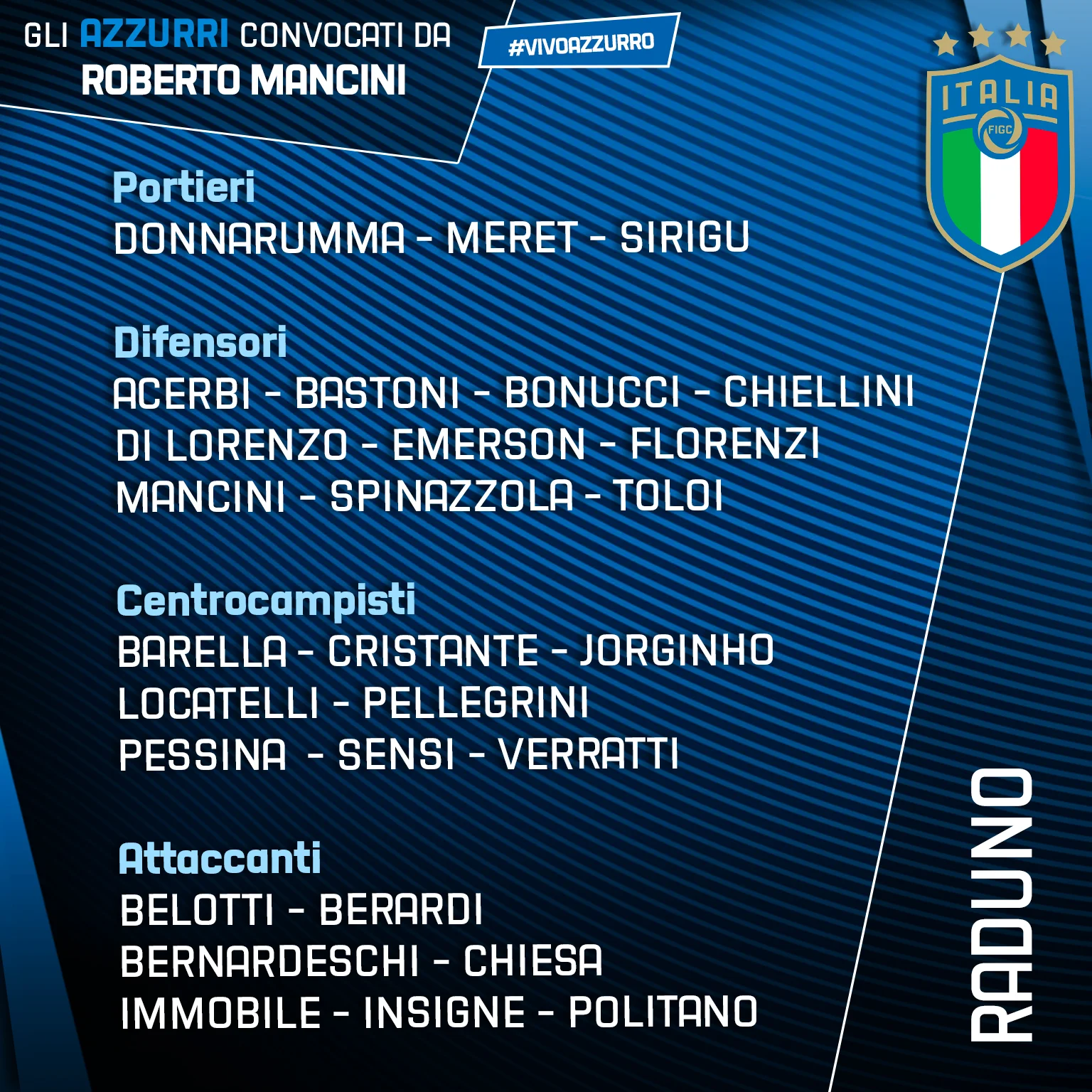Варто відзначити, що кожен учасник Євро зможе взяти з собою на турнір 26 гравців. Роберто Манчіні не вніс до заявки форварда ПСЖ Мойзе Кіна, який у минулому сезоні забив 19 голів, для порівняння – у Неймара 17 м'ячів.