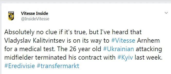 Калітвінцев, який нещодавно розірвав контракт з Динамо, найближчим часом може стати гравцем Вітесса, повідомляє vitesseinside.com.