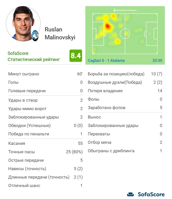 8.4 від Sofa Score – це найкраща оцінка у матчі з великим відривом від інших футболістів. До слова, так високо Руслана ще не оцінювали з моменту його переїзду в Італію. WhoScored поставив українцю 8.1 – кращим визнали лише Муріеля.