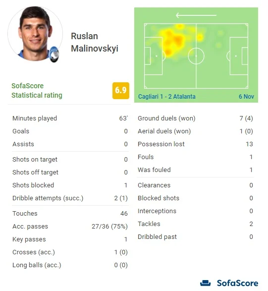 За весь матч Руслан лише раз спробував пробити по воротах, але ця спроба була заблокована. Конструктиву від українця бракувало – так, участі в гольовій атаці не віднімеш, але головна заслуга у взятті воріт належить іншим. Натомість 18-й номер Аталанти кілька разів вдало вступав у відбір, вигравши 4 дуелі.