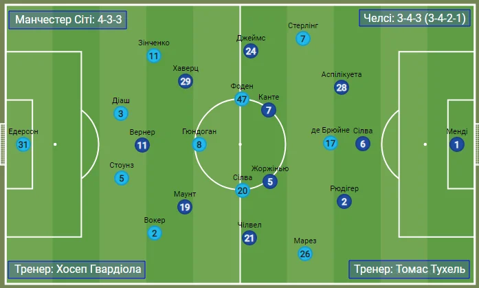 Тактична схема та стартовий склад Челсі були достатньо передбачуваними. Загалом під питанням була позиція правого інсайда, на якій зіграв Хаверц. Базова структура Сіті також була звичною, але сама система гри зазнала суттєвих змін. Насамперед це стосується конструктивної фази гри, але про це трохи згодом.