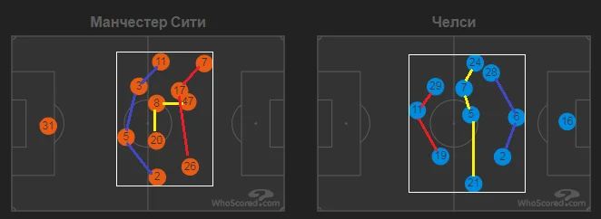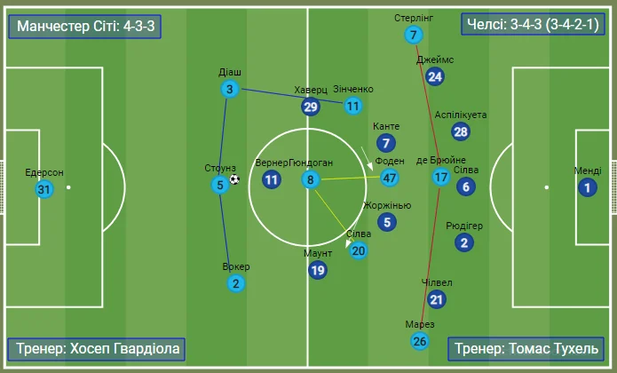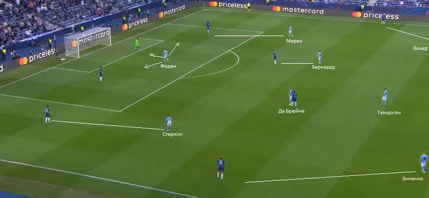 Зі структурами білд-апу Челсі та високого пресингу Сіті можна розібратися на скріншоті вгорі. Де Брюйне та Бернарду контролювали опорників команди Тухеля – Канте і Жоржінью відповідно. Вінгери з гандикапом тримали крайніх центрбеків, а мобільний Фоден повинен був тиснути на тих, хто контролює м'яч. Зінченко і Вокер дистанційно контролювали латералів.