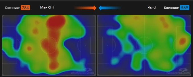 Томас Тухель свідомо віддав м'яч супернику і зробив ставку на швидкі атаки. Тому перевага чемпіонів Англії у володінні не є великим здобутком. Навпаки, навіть при обережній моделі у першому таймі лондонці майже не поступалися у контролі м'яча. Більшість своїх відсотків команда Гвардіоли здобула вже тоді, коли Челсі діяв із озиранням на рахунок, опускаючи глибше лінію захисту.