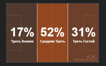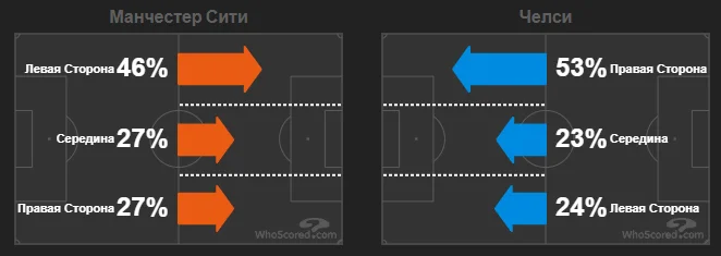 Обидві команди "завалювалися" на один фланг при побудові атак. Манчестер 46% своїх атакувальних дій провів через ліву вертикальну третину поля, а "сині" взагалі набрали на своєму правому фланзі більше половини від усіх ТТД. Щодо горизонтальних зон, то найбільша кількість подій у матчі відбувалися у другій третині поля. Маленький відсоток гри з м`ячем на третині поля Сіті не повинен вводити в оману. Команді Тухеля цього вистачило, щоб упевнено перевершити фаворита за важливішими показниками. Рахунок за очікуваними голами чудово відображає хід матчу – 1,59:0,52 на користь переможців.
