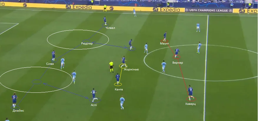 І Челсі, і Сіті відзначалися асиметричними побудовами в організації гри. Наприклад, лондонці, при білд-апі зміщували свою лінію оборони праворуч. Правий центральний – Аспілікуета – відходив на фланг, а Сілва (після травми – Крістенсен) та Рюдігер займали позиції для розіграша, як пара центрбеків.