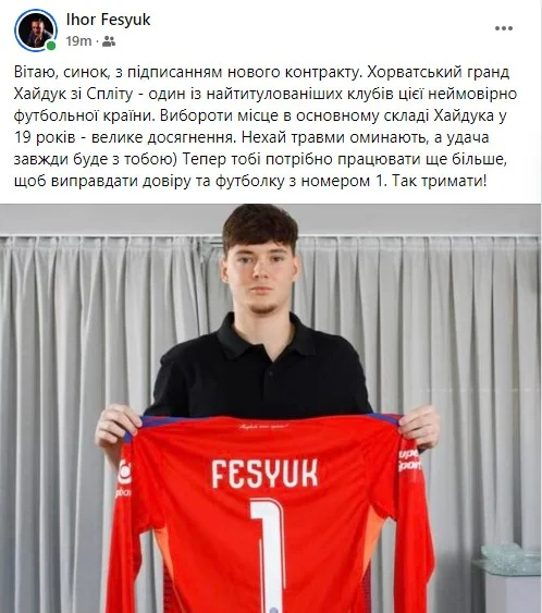 Батько голкіпера Ігор Фесюк привітав свого сина з цим досягненням. "Вітаю, синку, з підписанням нового контракту. Хорватський гранд Хайдук зі Спліта – один із найтитулованіших клубів цієї неймовірно футбольної країни. Завоювати місце в основному складі Хайдука в 19 років – велике досягнення. Нехай травми обходять, а удача завжди буде з тобою. Тепер тобі потрібно працювати ще більше, щоб виправдати довіру і футболку з номером 1. Так тримати!", – написав батько Фесюка у Facebook.