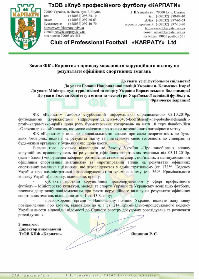 На офіційному сайті "зелено-білих" з'явилася заява з приводу можливого корупційного впливу на матч чемпіонату України. Як зазначено в опублікованій заяві виконавчого директора Карпат Ростислава Ящишина, клуб глибоко стурбований інформацією, оприлюдненою напередодні футбольними журналістами щодо руху букмекерських котирувань на матч 10-го УПЛ Олександрія – Карпати, що може свідчити про ознаки потенційного договірного матчу.