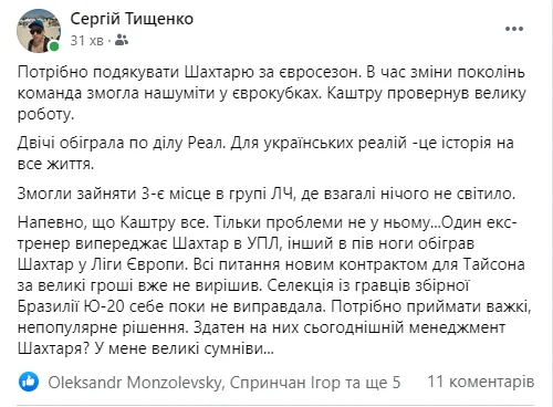 Попри поразку, Сергій Тищенко має за що подякувати Луческу.