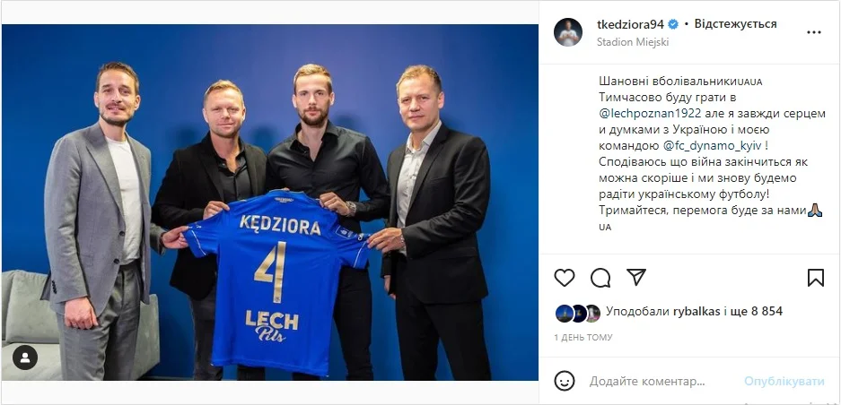 "Шановні українські вболівальники. Тимчасово буду грати в Леху, але я завжди серцем і думками з Україною і моєю командою – Динамо!