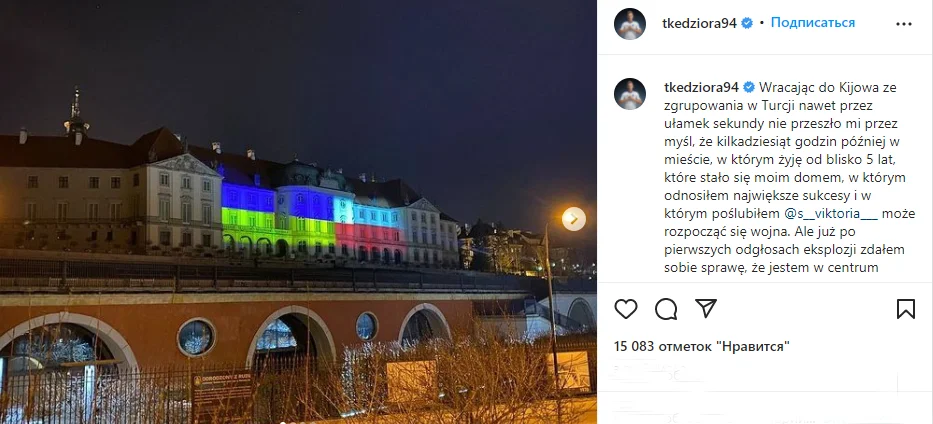 Але після перших звуків вибухів я зрозумів, що опинився в центрі небезпечних подій. Сьогодні, завдяки прихильності багатьох людей, я вже зі своєю родиною в Польщі. Останніми днями я отримав сотні повідомлень зі словами підтримки, на багато з яких я ще не встиг відповісти, але всі вони для мене багато значать.