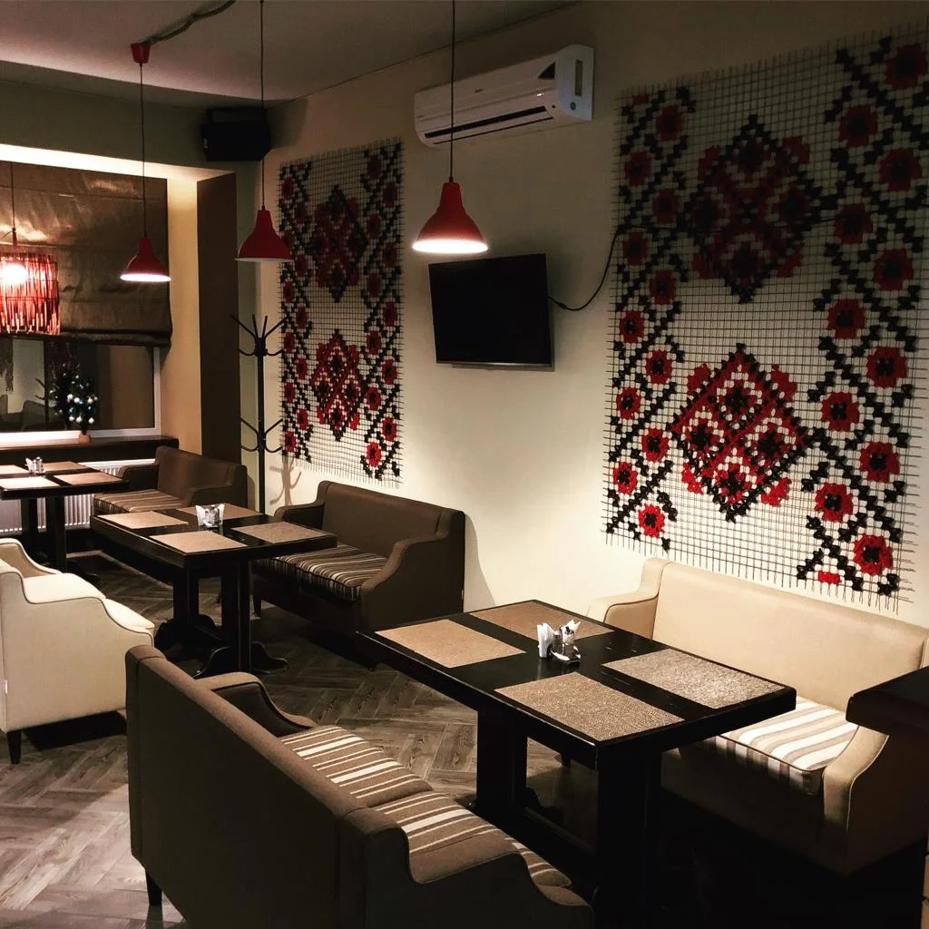 – Інтер’єр цього закладу особливий і його основу складає візерунок у стилі вишиванки. Ваша ініціатива чи дизайнерський задум?