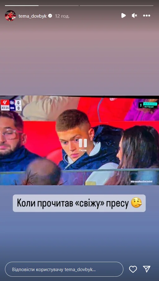Реакція Довбика на прочитане у пресі була більш ніж красномовною. На своїй сторінці у соціальній мережі Instagram він виклав фото з трансляції, на якому з величезним подивуванням дивиться у телефон. "Коли прочитав "свіжу" пресу", – підписав світлину Артем.