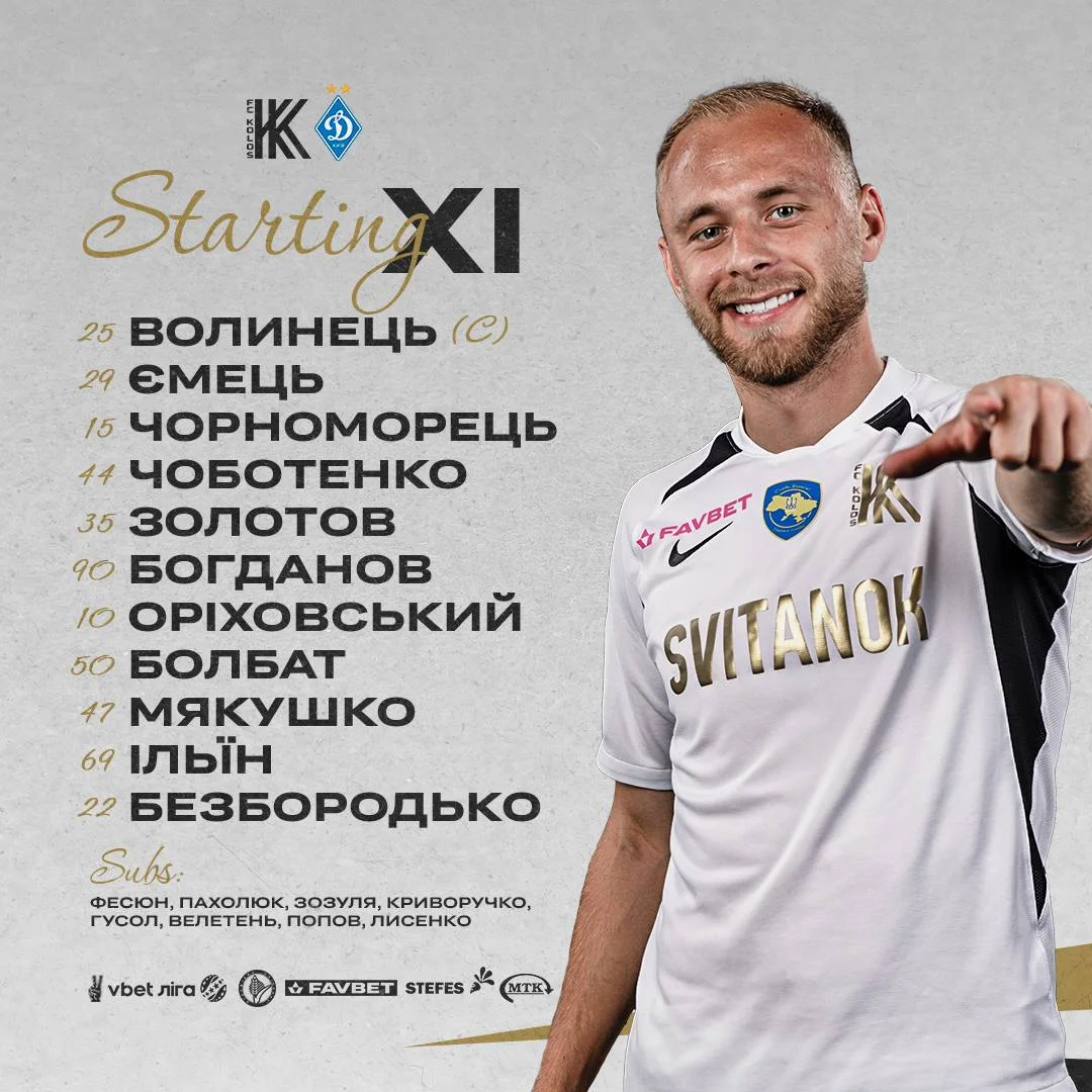 Уперше за майже пів року в основі киян виходить після серйозної травми голкіпер збірної України Георгій Бущан. Інша зміна після погрому Олександрії вимушена. Ерік Рамірес замінив дискваліфікованого Владислава Ваната. Цікаво, що капітан Сергій Сидорчук починає на лаві запасних після непоганого матчу, який видала пара Андрієвський/Шепелєв у центрі поля. Також уперше за 8 з половиною місяців до заявки потрапив Микола Шапаренко.